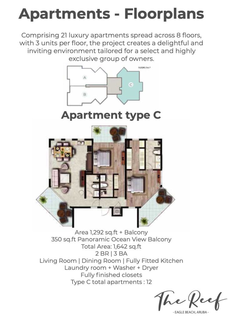 Area 1,292 sq.ft + Balcony, 350 sq.ft Panoramic Ocean View Balcony Total Area: 1,642 sq.ft, 2 BR | 3 BA , Living Room | Dining Room | Fully Fitted Kitchen Laundry room + Washer + Dryer, Fully finished closets, Type C total apartments : 7