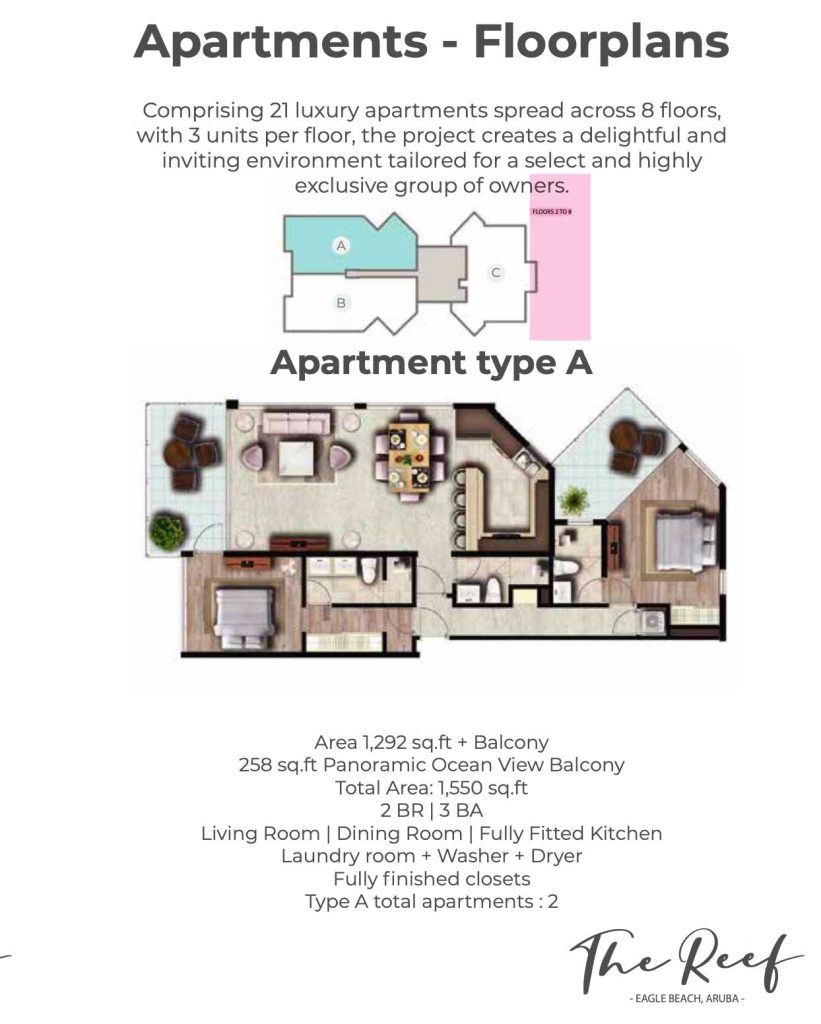 Area 1,292 sq.ft + Balcony, 258 sq.ft Panoramic Ocean View Balcony Total Area: 1,550 sq.ft, 2 BR | 3 BA, Living Room | Dining Room | Fully Fitted Kitchen Laundry room + Washer + Dryer, Fully finished closets, Type A total apartments: 7